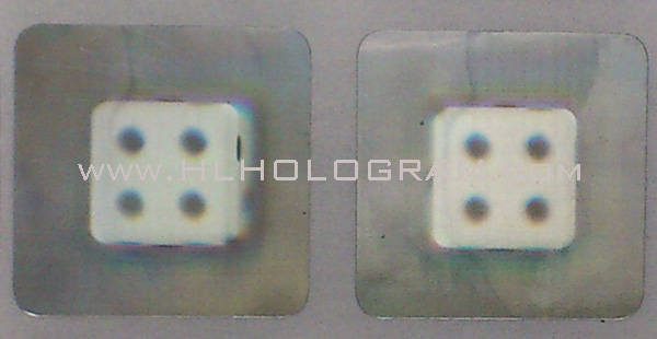 This hologram is E-beam type 3D hologram. The 3D dice hologram is made of much smaller hologram dots than Dot-matrix system. E-beam system can make even nano size grating dots. There're much more flips than dot-matrix 3D. Both dot-matrix 3D and E-beam 3D hologram will get blur when viewing outside. The color and image is not so good as classical hologram which is record from lab.