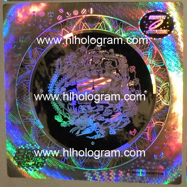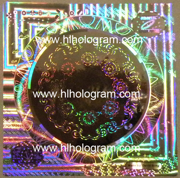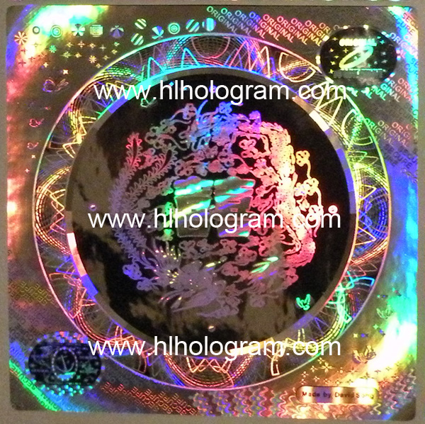 left bottom) with the star background is made by digital 3D holograms. The small ring and anchor image shows good 3D effect and depth. This hologram sticker size is 50mm*50mm. There's lots kind of dot matrix effects included in this hologram stickers, such as animated multi color lines movement, animated flying bird, sparkle effect, kennetgram, modulate depth effect, dead color(solid white color), peralogram with chennals, raster text, microtext multi color, gradient effect, concealed text, expanding colors, speider's net gradiation effect, kinematic, dots grating, shrinking & kinematic, kinematic movement dots in different styles. All these are simple dot-matrx effects which is achieved easily by dot matrix system.