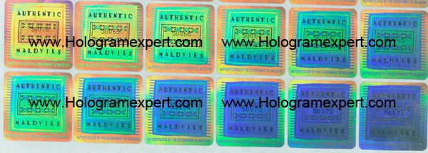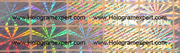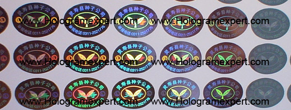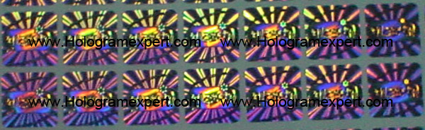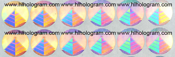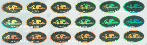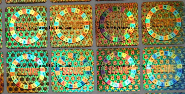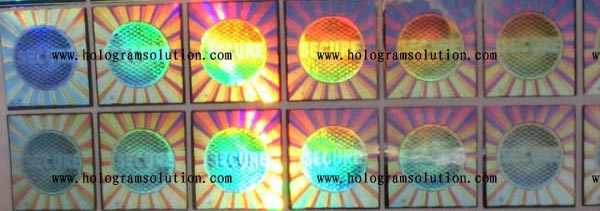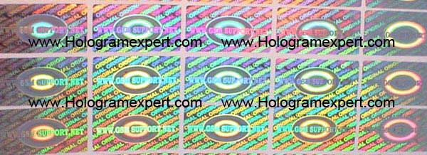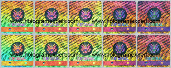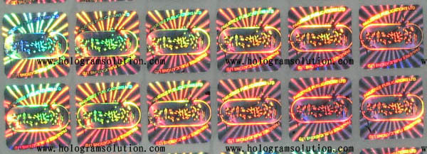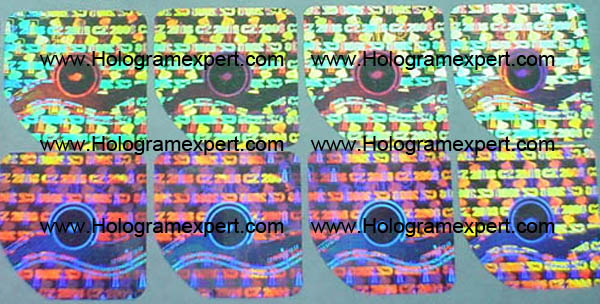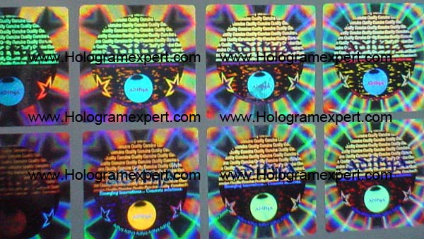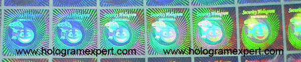 We can make very good design customized holograms with your logo and company's name with Hidden text & micro text, Laser hidden(cover) image, Moire hidden/Decoder image, Kinematic guilloche elements, True Ccolor/Photo/Figures, Flip-Flop/switching/multi-channel, Solid white, Flash light(kinematic), Fingerprint, Random effect hologram effects to enhance hologram security.