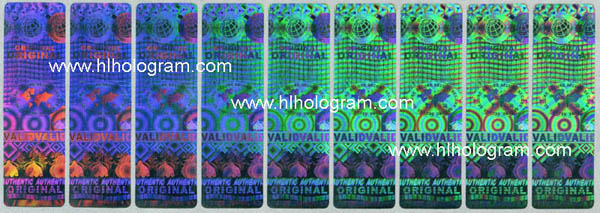 50mm*15mm . It has word VALID, ORIGINAL, AUTHENTIC on sticker. Silver. Dot-matrix Holographic Label. Its material PET film can be in color of silver, golden and blue. It can be transparent film too.