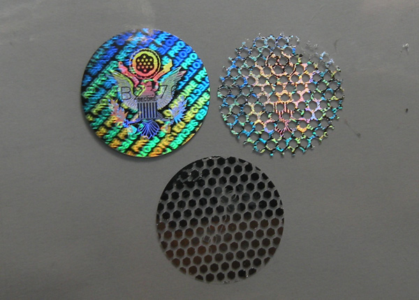 Destructive tamper proof hologram sticker has 3 layers: PET film, hologram metallization layer and glue. Silver Color. 3D holographic security labels, security hologram stickers for authentication and protection against counterfeit.
