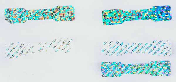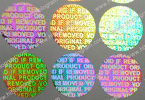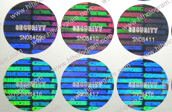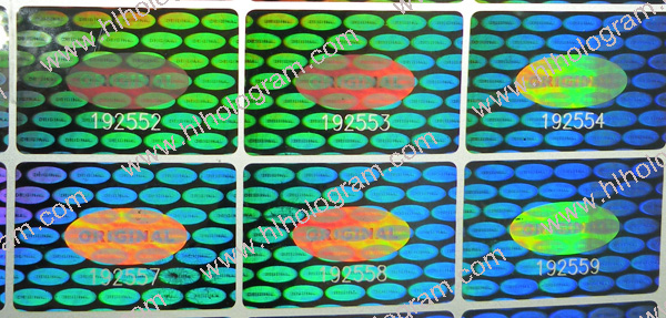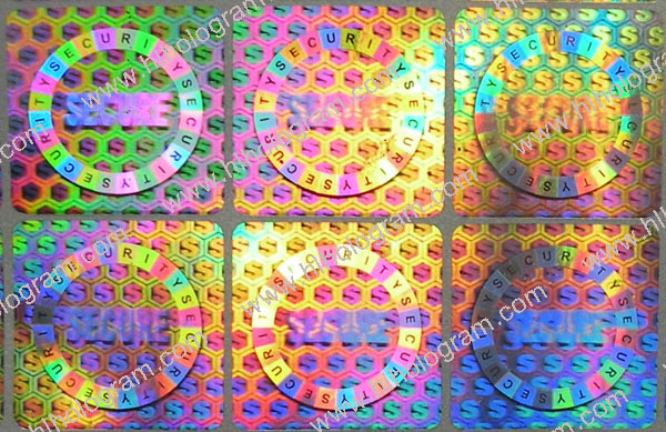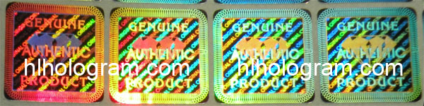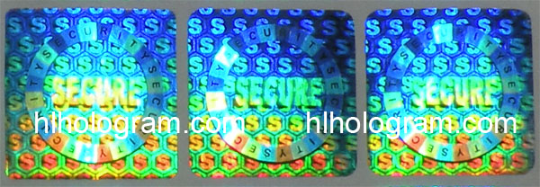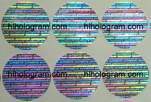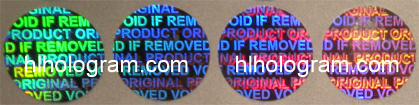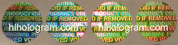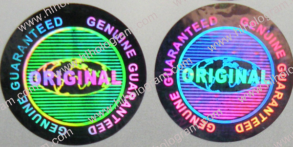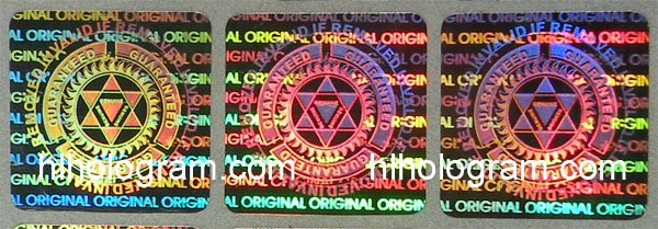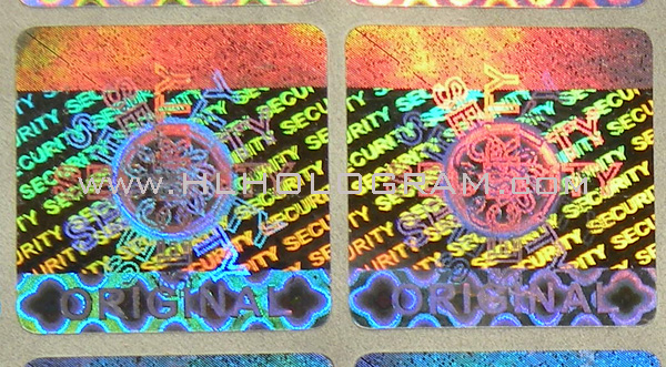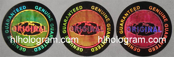 General design hologram stickers have word such as 'ORIGINAL', 'AUTHENTIC', 'VALID', 'GENUINE', 'SECURITY' on stickers. Everyboy can buy these stickers. Because they are general design, so it doesn't charge holographic master fee when you buy these general design hologram stickers. The base color of material can be silver, golden, blue, red. The thickness of Aluminum PET film(sticker raw material) can be 25 micron, 36 micron or 50 micron. These stickers can be tamper evident, tamper evident pattern released('VOID', 'ORIGINAL', 'CANCELED', 'Hony Comb'), or red or black overprinting released. All of these general dessgn hologram stickers can have transparent continuous serial(running) numbers on engraved. Some of them can be printed on overprinting continuous serial(running) numbers. Following images are photoes of general design hologram stickers in different size and different shape we have in stock. General design No.28 can be die-cutted whatever shape you want. Some of these general design hologram stickers have Mole hidden text and laser readable text inside.