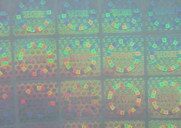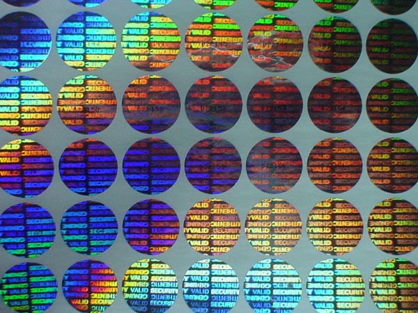 Hologram sticker, tamper evident with dot-matrix kinematic revolving ray movement effect.