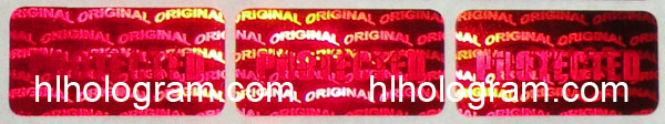 This holographic sticker is 2D/3D type. It has text 'Security Holographic Sticker' in foreground. and small text 'ORIGINAL' in background.The size of sticker is 28mm*18mm.