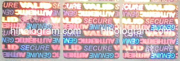 This holographic sticker is 2D/3D type. It has text 'VALID, AUTHENTIC, SECURE, GENUINE'. The size of whole