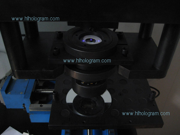 There're two type of 2D/3D master shooting. One way is to shoot master by H1 glass to make hologram text or image in background. Another way is to shoot master by hologram image maker facility directly.To shoot master by hologram image maker facility directly, all forground image and background image can be shooted in same way(no need to make H1 glass for background first). It's much easily way than to make background by H1 glass. Master shooted by hologram image maker facility also is much shining and clearn without noise wrinkle than the master shooted in another way, especially, on big rainbow area. To shoot master by hologram image maker facility, we need automatic position localization equipment to locate record glass position precisely. To shoot master by H1 for background, we have to control position platform manully.