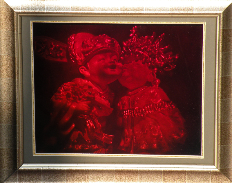 3D holography of wedding. This art hologram has good real 3D hologram effect with wood frame. It's size is 250mm*200mm. . It's different to hologram sticker which is embossed very fast by mass production embossing machine. The art hologram is recorded onto a photographic glass(photoresist) by two laser beam directly.
