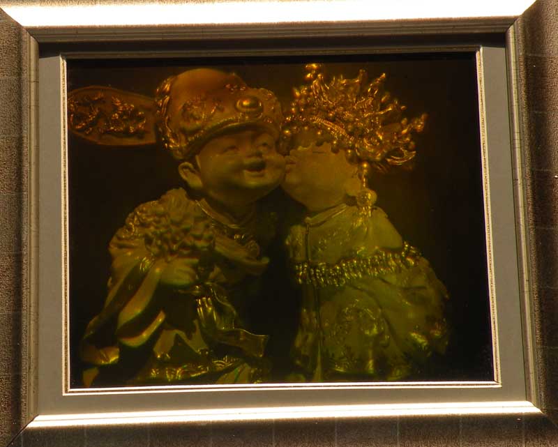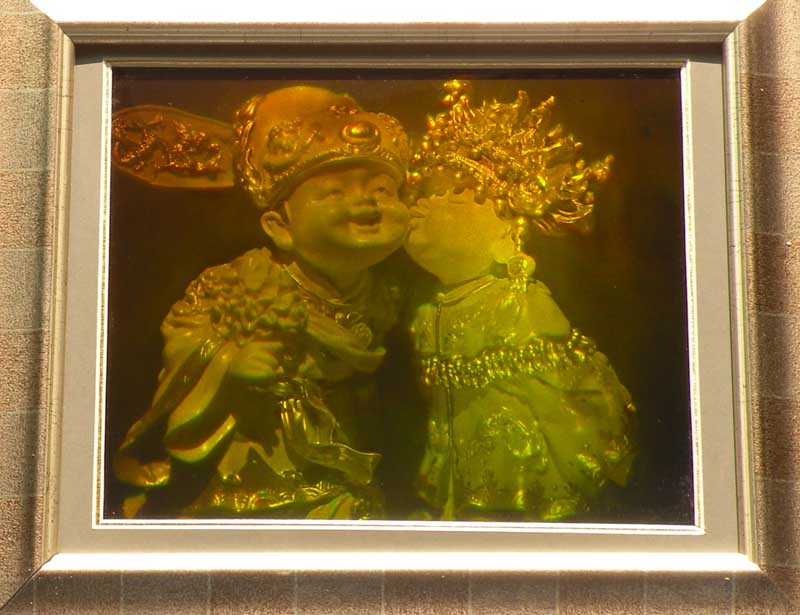 Another viewing angle of wedding 3D holography. This art hologram has good real 3D hologram effect with wood frame. It's size is 250mm*200mm. . It's different to hologram sticker which is embossed very fast by mass production embossing machine. The art hologram is recorded onto a photographic glass(photoresist) by two laser beam directly. Eye-catching art hologram is recorded on to a photographic glass(photoresist). It displays a virtual object reproduces real 3D magic hologram and play a vital role to get the impact and attention you have been seeking. High artistic value 3D art holography can produce spectacular displays for educational, medical, scientific, artistic and commercial purposes.