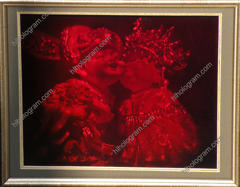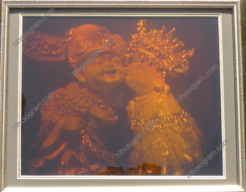 3D holography of a wedding. This art hologram has good real 3D hologram effect with wood frame. It's size is 250mm*200mm. . It's different to hologram sticker which is embossed very fast by mass production embossing machine. The art hologram is recorded onto a photographic glass(photoresist) by two laser beam directly. Eye-catching art hologram is recorded on to a photographic glass(photoresist). It displays a virtual object reproduces real 3D magic hologram and play a vital role to get the impact and attention you have been seeking. High artistic value 3D art holography can produce spectacular displays for educational, medical, scientific, artistic and commercial purposes.