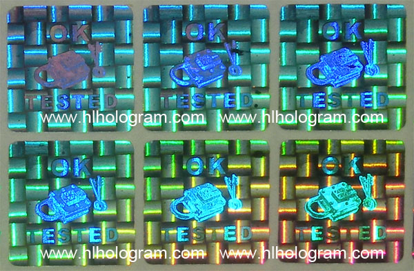 Kinematic movement hologram image can be made both by 2D/3D and dot-matrix type hologram. 2D/3D hologram kinematic movement comes from a sequential different viewing angle hologram lines with different color separation. 2D/3D hologram kinematic movement will have good result with shining hologram image with good design having 3-6 color sperated properply. Dot-matrix hologram kinematic movement effect is more smoothly than 2D/3D kinematic movement because Dot-matrix hologram machine can have more flips with more viewing angle than 2D/3D hologram lab. With our special digital Dot-matrix hologram and 2D/3D hologram technology, customized design logo or graph can be incorporated onto good kinematic movement hologram-patterns.