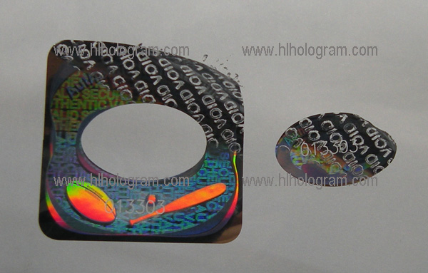 Holographic label with dual laser etched serial number '013307' ,'013307'. This double serial number is one set numbering for security. This hologram is VOID tamper evident holographic label.