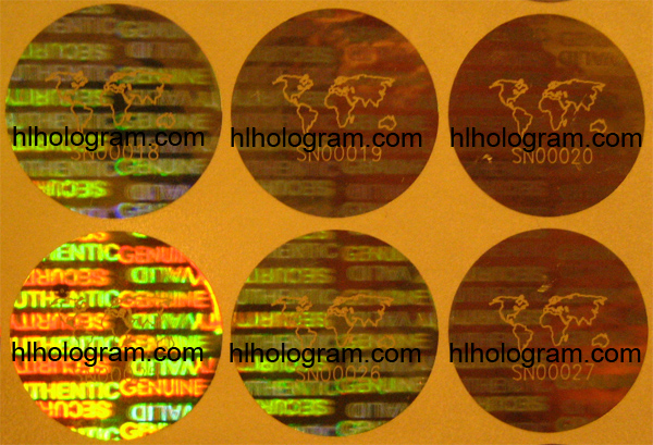 Hologram sticker with demetalized serial number started from 'SN00001' and global map logo. This trasparent see through serial number has better security than black ink numbers. Your logo and serial number can be made on nay generic design holograms. Click to see Generic Stock Design Holographic Sticker