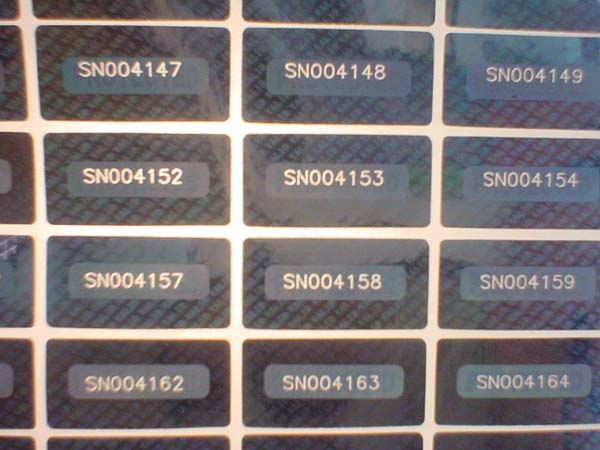 Holographic label with dual laser etched serial number 'A10012679' , This double serial number is one set numbering for security.