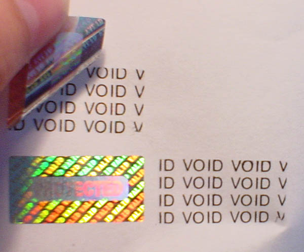 VOID released hologram sticker leaves VOID residue after holographic label is peeled off.