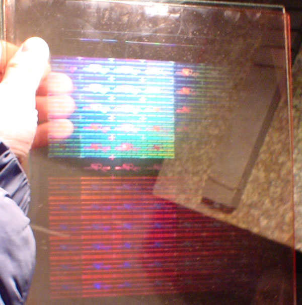 This is silver layer coated photosensitive glass master photo of above glass master. After silvering, glass get conducting, so we can put it into electronic forming tank to make master origination.